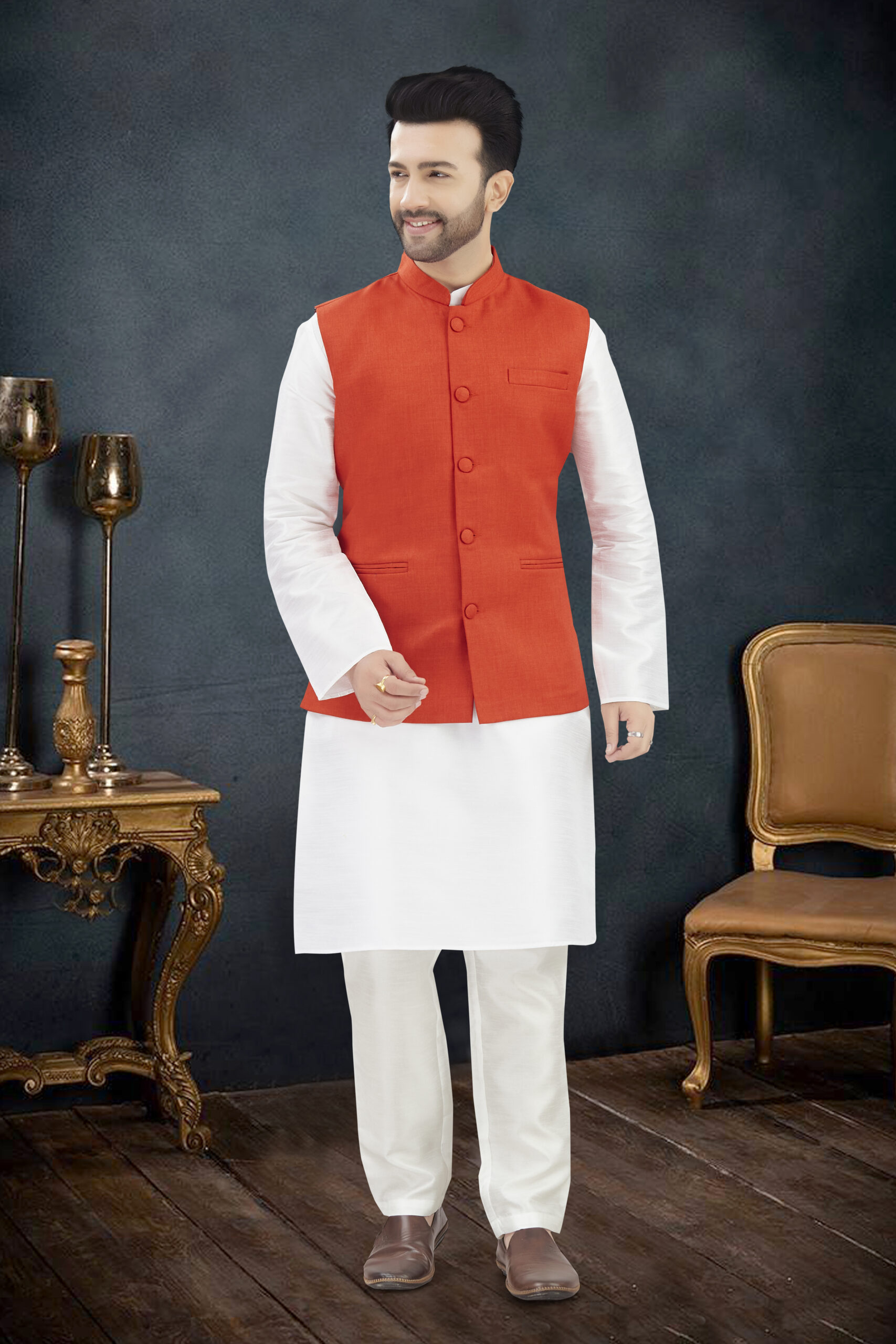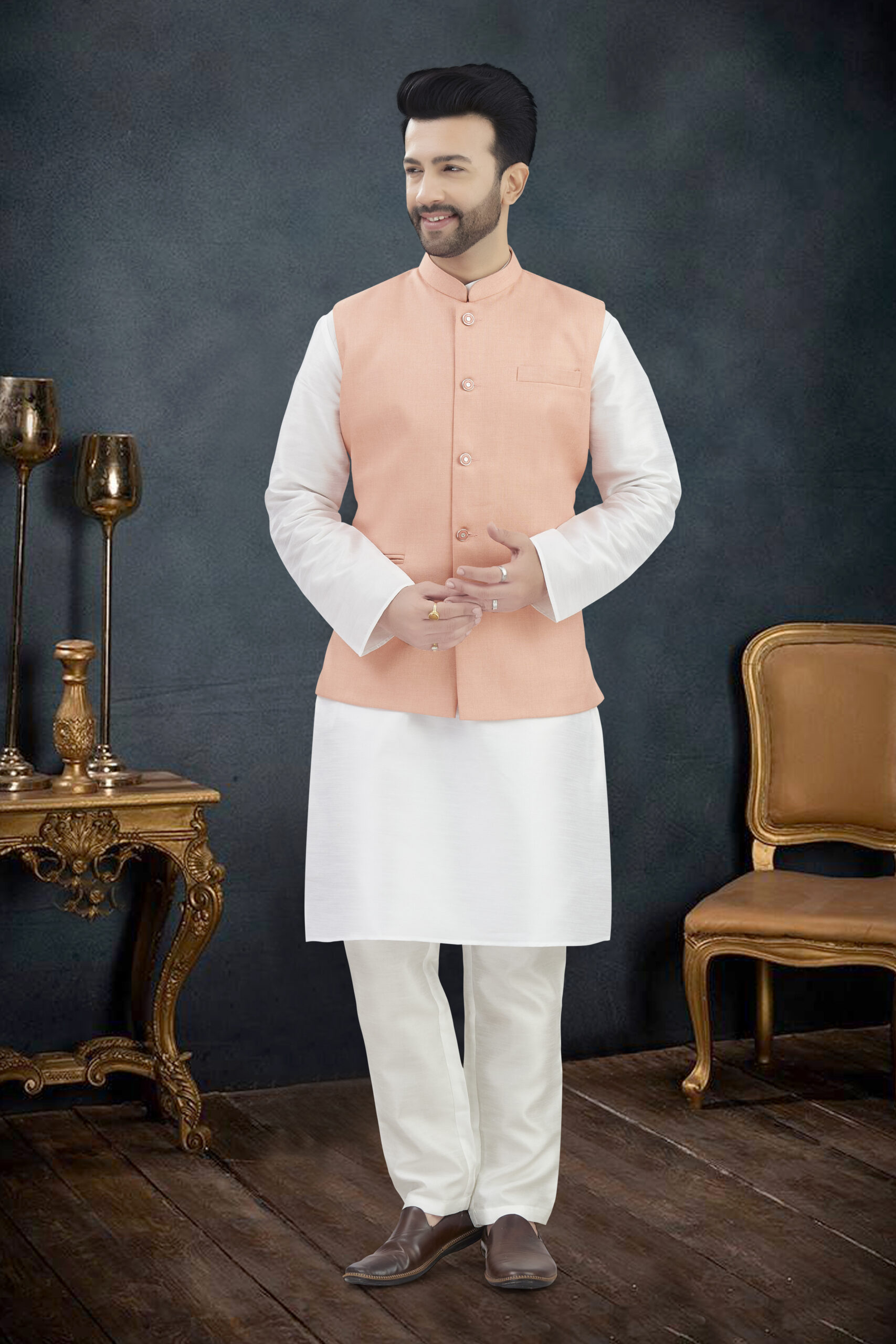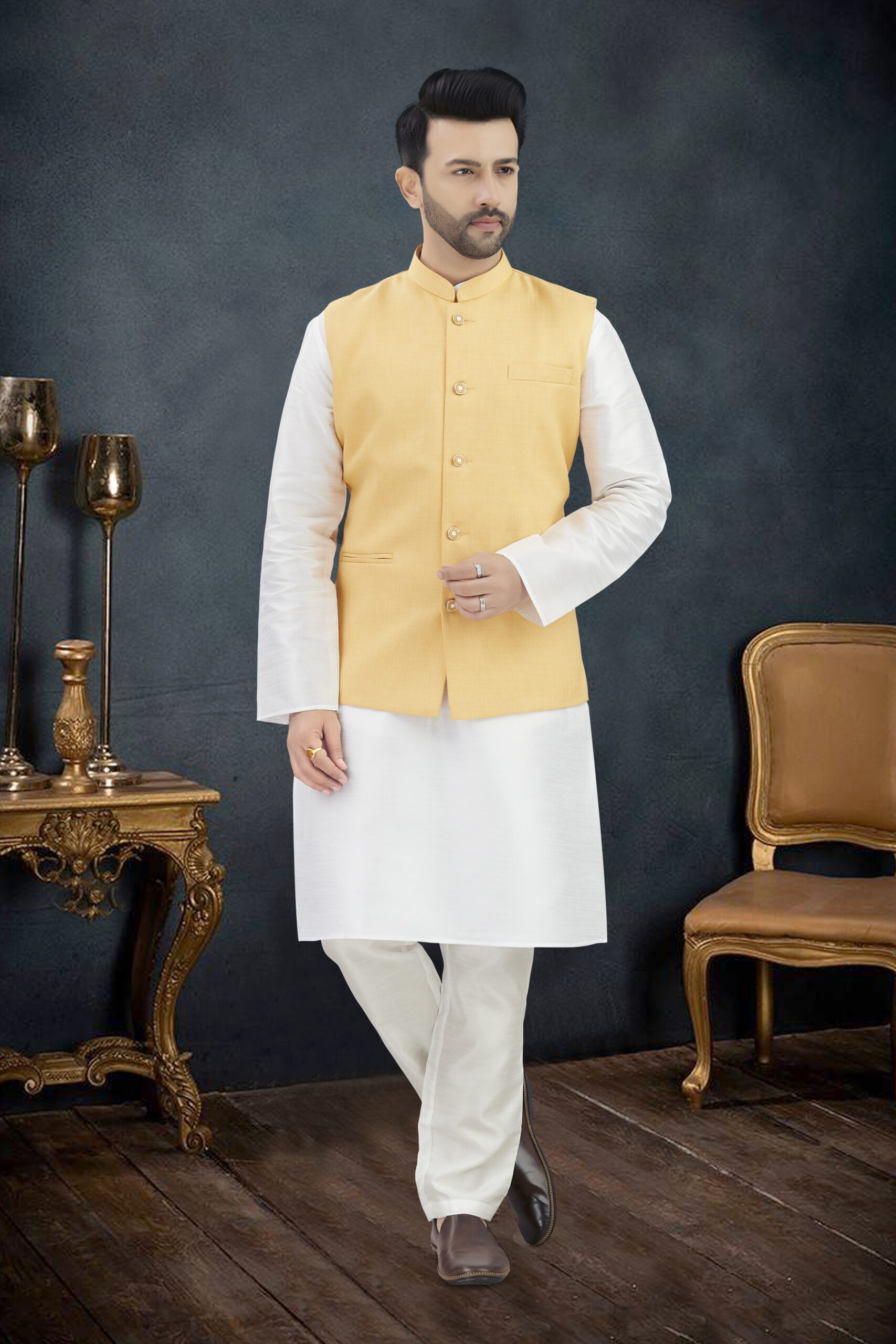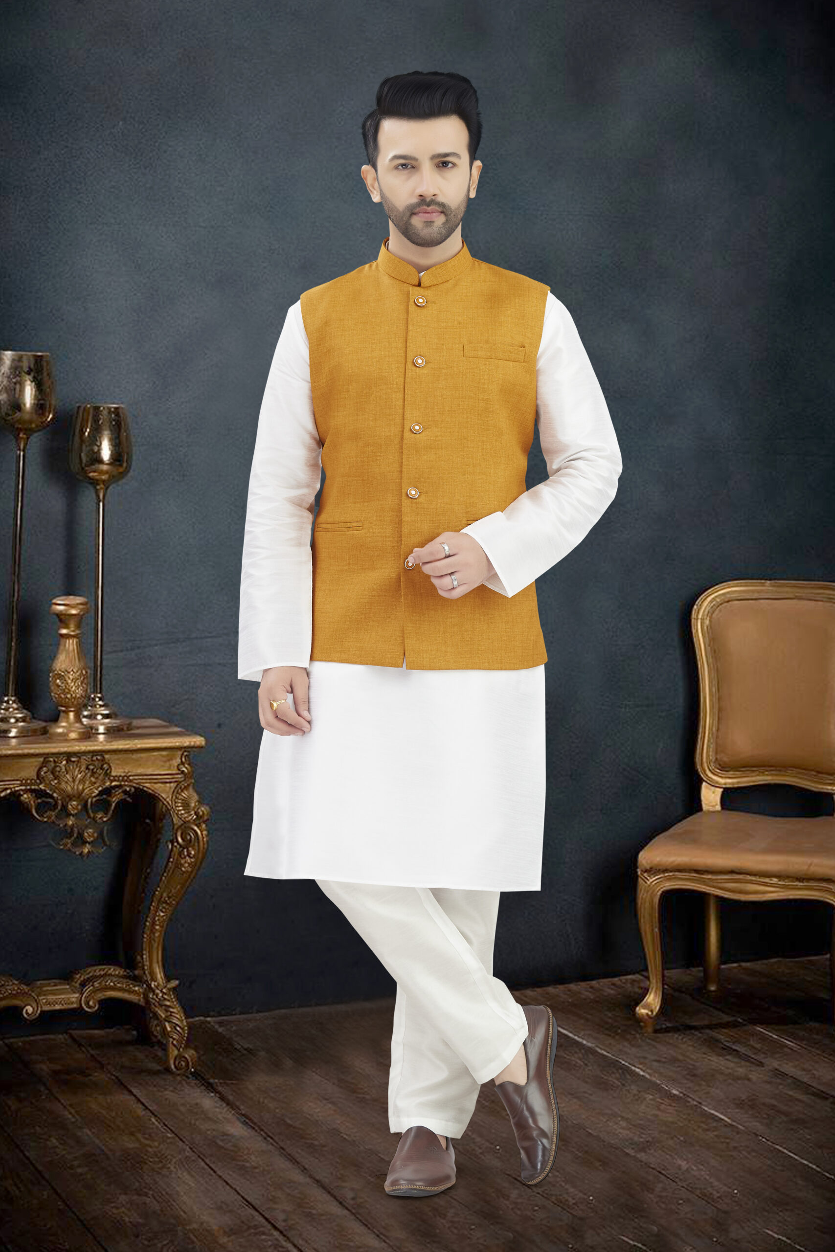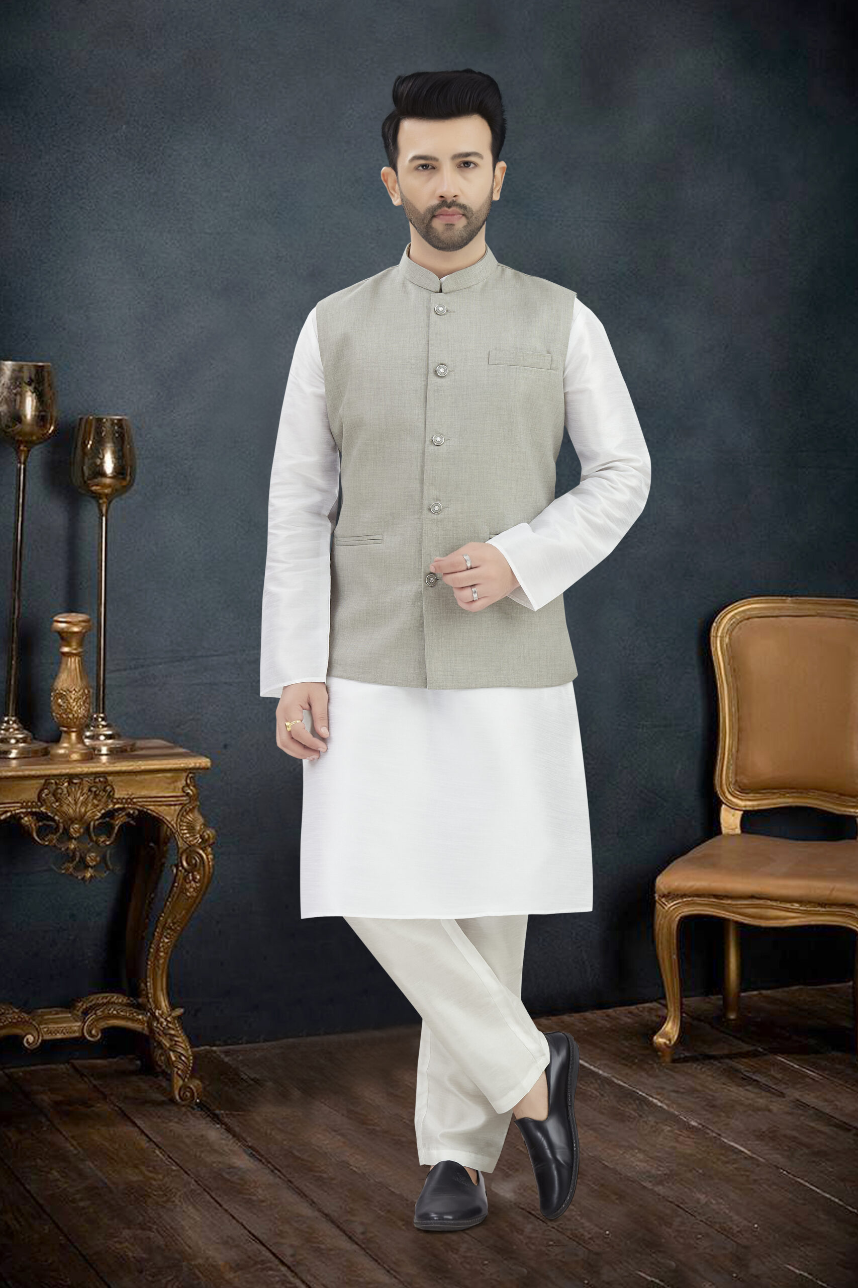 Make an unforgettable impression in ourLINEN COTTON KURTA SET WITH JUTE FABRICS WAIST-COAT, who appreciate classic luxury. Crafted with premium LINEN COTTON KURTA SET WITH JUTE FABRICS WAIST-COAT, The entire ensemble is adorned with intricate self-colored , offering a sophisticated, tone-on-tone elegance perfect for wedding receptions, cocktail parties, or grand celebrations.